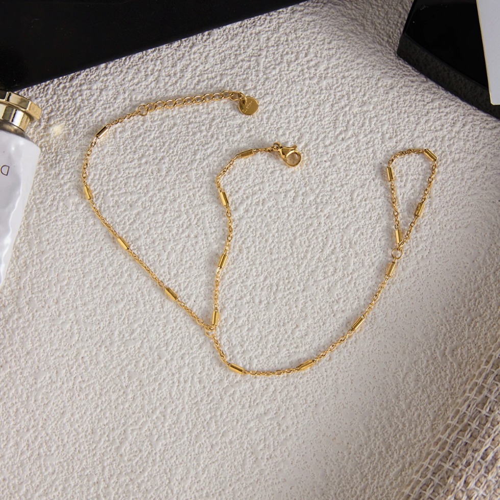 Minimalist bamboo stick bracelet, 18K gold plated stainless steel – elegant, trendy, and durable women’s jewelry.