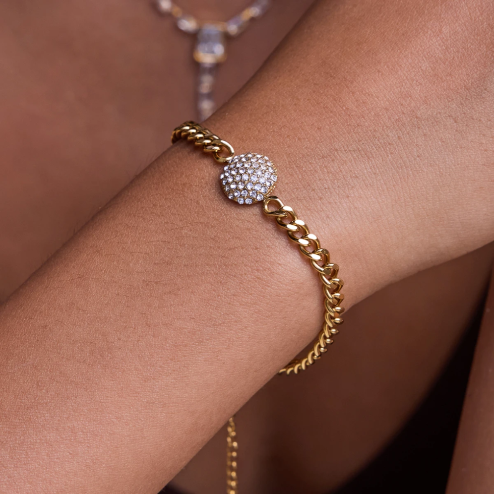 Stainless steel Cuban chain bracelet with white zircon stones – minimalist, durable, and elegant for women.
