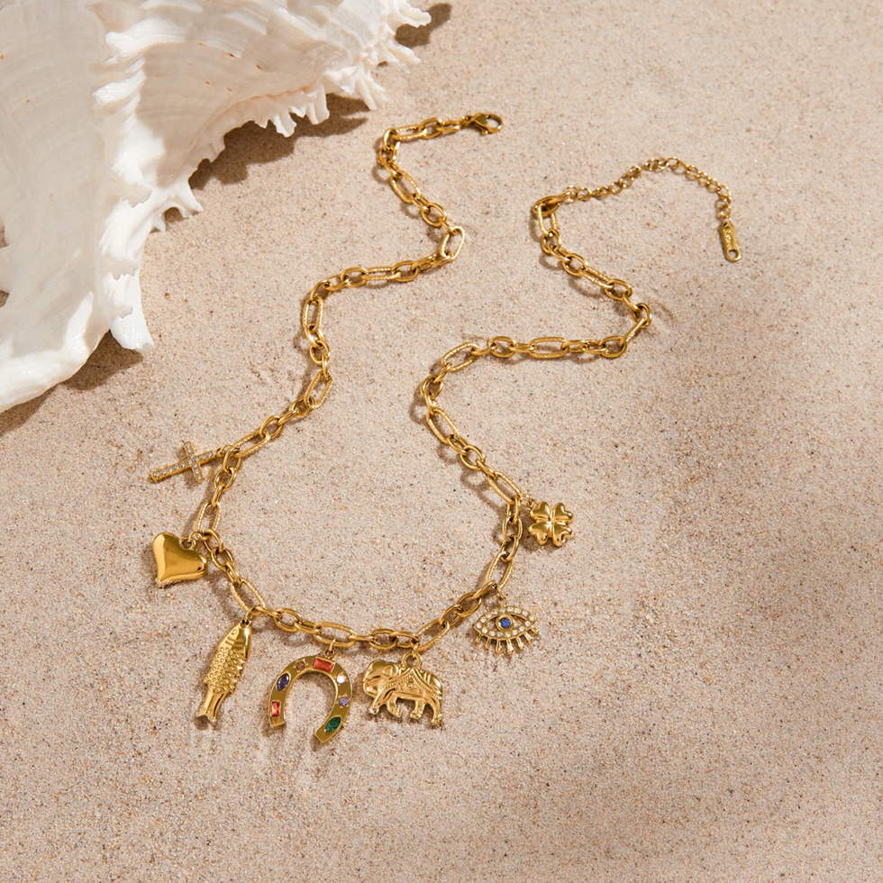 Lucky Horseshoe Evil Eye Heart Cross Pendant Necklace – 18K Gold Plated